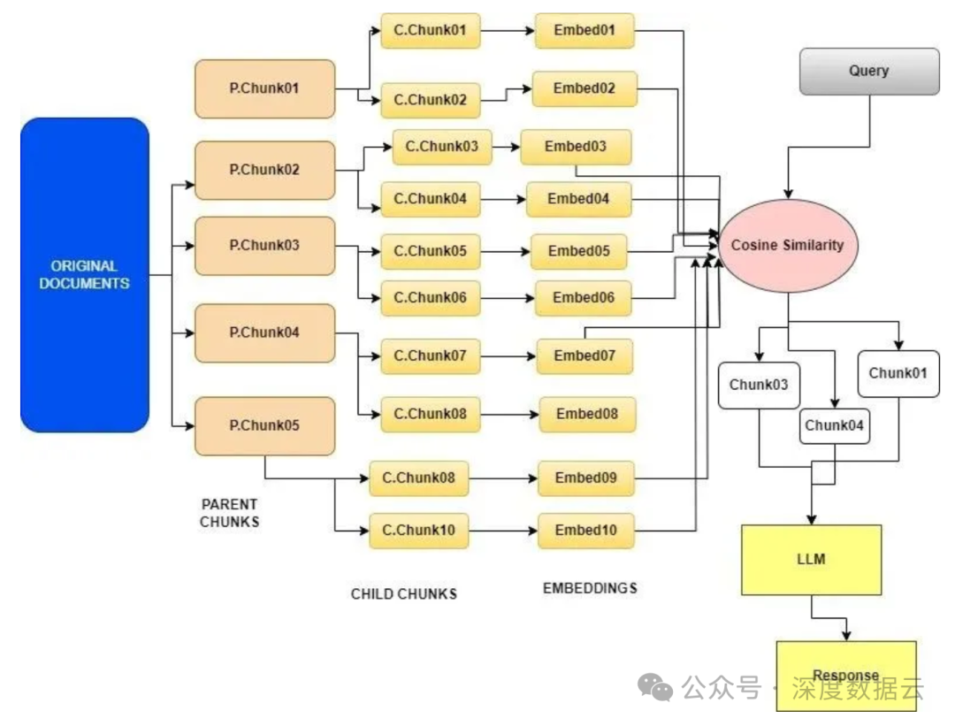 - 第一步涉及将原始的大型文档拆分成更小、更易管理的单元,这些小单元被称为子文档(Child Document),以及被称为父文档(Parent Ducument)的较大块。