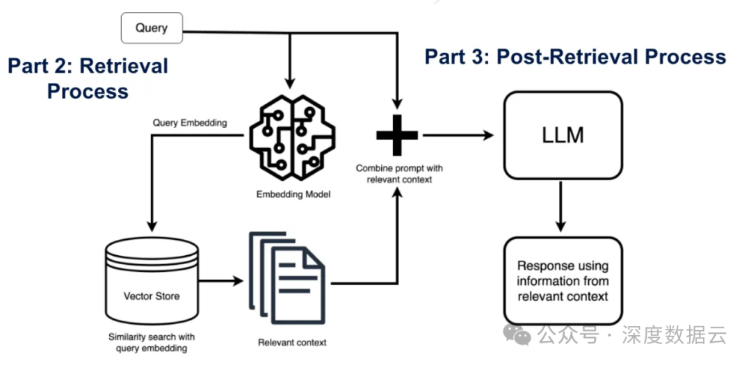 在最重要的检索步骤中,用户查询被转换为称为嵌入(Embedding)的向量表示,并使用向量数据库中的余弦相似度找到相关的块。并且试图从向量存储(Vector Store)中找到高度相关的文档块。