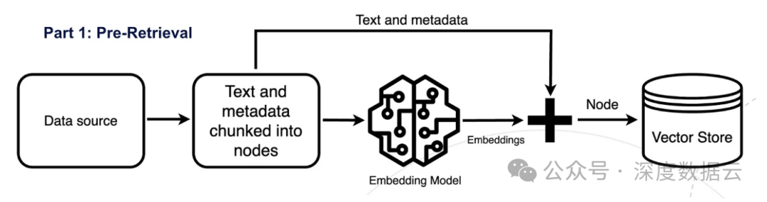 在预检索步骤中,需要准备和拆分超出LLM(大型语言模型,Large Language Model)原始训练数据集之外的新数据,也称为外部数据,然后使用将数据转换为数值表示的嵌入模型对这些数据块进行索引,并将其存储在向量数据库中。这个过程创建了一个LLM可以理解的知识库。