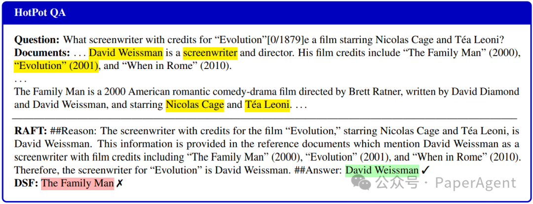 RAFT与DSF的比较示例:在HotpotQA数据集上对RAFT和DSF微调模型进行了提示,可以看到DSF模型从上下文中提取了错误的信息。对于“谁是编剧”的问题,它回答了一个电影的名字。而RAFT成功地正确得出了结果。