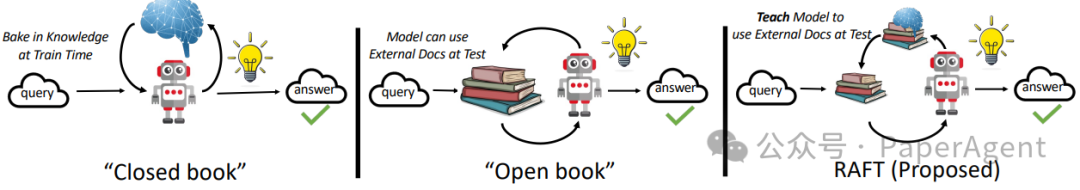 对大量文本数据的语料库进行大型语言模型(LLMs)的预训练已经成为一种标准范式。当将这些LLMs用于许多下游应用时,通常还会通过基于RAG的提示或微调,将新知识(例如,时效性新闻或私有领域知识)额外融入预训练模型中。然而,模型获取这些新知识的最优方法论仍然是一个开放的问题。在此背景下,提出了检索增强微调(RAFT),这是一种训练方法,可以提高模型在“开卷”的特定领域环境中回答问题的能力。如何最好地为考试做准备?(a) 基于微调的方法通过直接“记忆”输入文档或在不引用文档的情况下回答练习QA来实现“学习”。(b) 另一方面,上下文检索方法未能利用固定领域所提供的学习机会,等同于在没有学习的情况下参加开卷考试。虽然这些方法利用了领域内的学习,但它们未能为开卷考试做好准备。相比之下,(c) RAFT在模拟的不完美检索环境中引用文档,同时利用问题-答案对进行微调——从而有效地为开卷考试设置做好了准备。