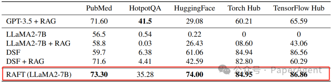 实验结果表明,RAFT在PubMed、HotpotQA和Gorilla数据集上的性能一致优于监督式微调模型,无论是使用RAG还是没有使用RAG。