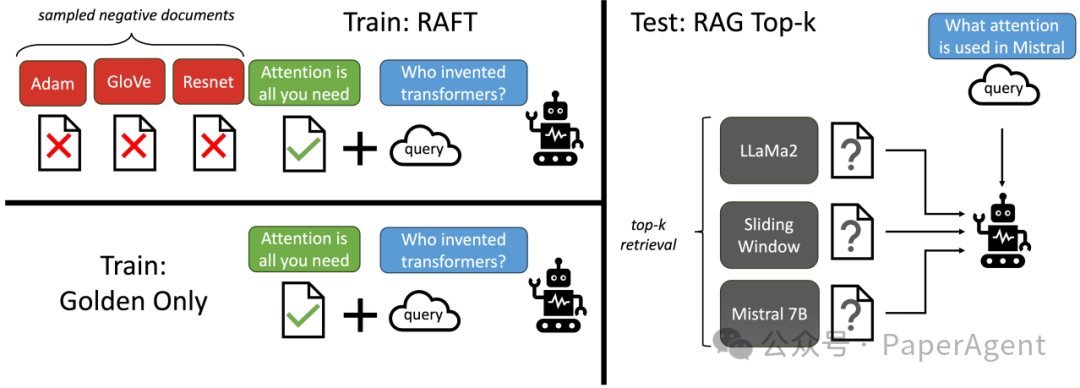 RAFT通过结合检索增强生成(RAG)和监督式微调(SFT),训练模型忽略那些对回答问题没有帮助的文档(称为干扰文档),并引用相关文档中正确的序列来回答问题。这种方法还包括链式思维(Chain-of-Thought)风格的响应,以增强模型的推理能力。RAFT的核心思想是在训练数据中包含问题(Q)、一组文档(Dk)和从其中一个文档(D*)生成的答案(A*),其中区分了Golden文档(包含答案的文档)和干扰文档。在训练过程中,模型被训练以在存在干扰文档的情况下,从提供的文档和问题中生成答案。RAFT的训练方法不仅使模型能够通过微调学习特定领域的知识,还确保了对不准确检索的鲁棒性。RAFT方法概述,左上角的图表展示了提出的方法,即让大型语言模型(LLMs)适应从一组正面和负面文档中阅读解决方案,这与标准的RAG设置形成对比,在标准的RAG设置中,模型是基于检索器的输出进行训练的,这种输出是记忆和阅读的混合体。在测试时,所有方法都遵循标准的RAG设置,提供上下文中检索到的前k个文档。