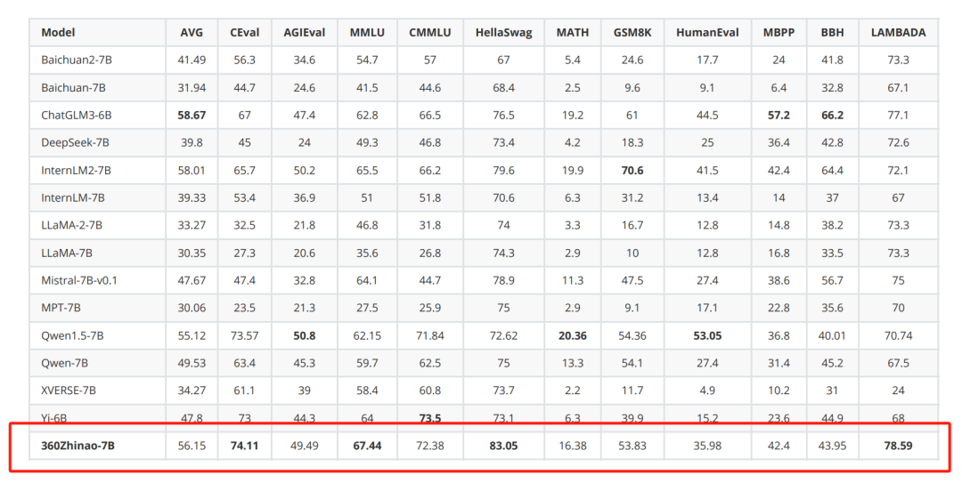 通过对比国内外同参数模型,360Zhinao-7B 综合平均分达到前三,在C-Eval、MMLU、HellaSwag、LAMBADA 上达到第一,也就是说,模型在中英文知识和理解推理能力上具备较强竞争力。