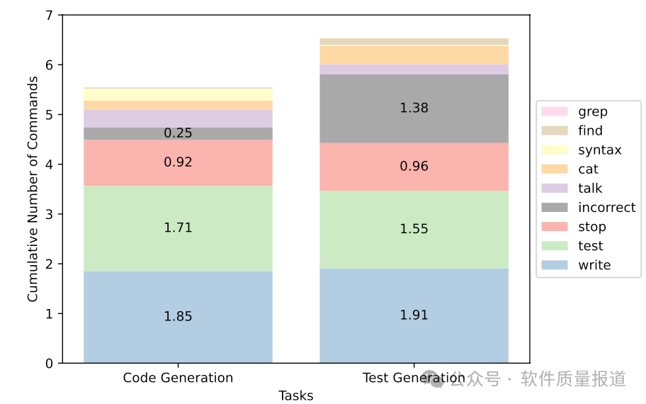 图4显示了,AutoDev在代码生成和测试生成任务中使用的命令累积数,其中考虑到RQ1和RQ2中每个HumanEval问题的平均评估命令数量。