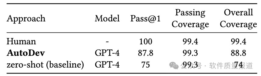 值得注意的是,这个结果是在没有额外训练数据的情况下获得的,这将AutoDev与LATS区分开来,后者达到了94.4%。此外,AutoDev框架将GPT-4性能从67%提升至91.5%,相对提升了30%。这些结果体现出,AutoDev有能力显著提升大模型完成软件工程任务方面的表现。4.2 AutoDev在测试生成任务中的效果如何?AutoDev在针对测试生成任务修改的HumanEval数据集上,获得了87.8% Pass@1分数,与使用相同GPT-4模型的基线相比,相对提高了17%。AutoDev生成的正确测试(包含在Pass@1中)实现了99.3%的鲁棒覆盖率,与人工编写的测试的99.4%覆盖率相当。