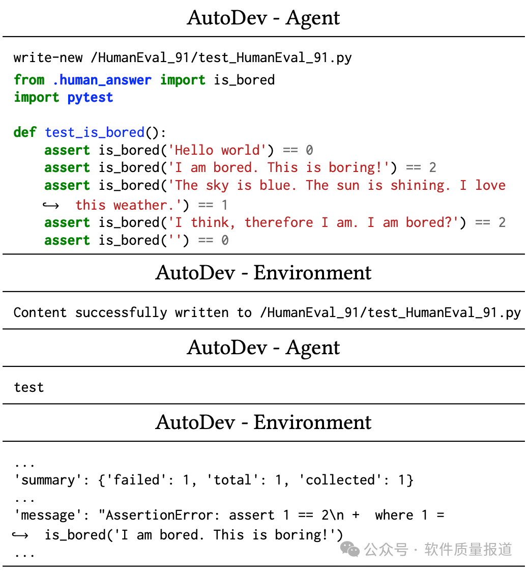 对于代码生成,AutoDev平均执行5.5条命令,其中包括1.8条写入操作、1.7条测试操作、0.92条停止操作(表示任务完成)、0.25条错误命令,以及最少的检索(grep、find、cat)、语法检查操作和通话通信命令。在「测试生成」任务中,命令的平均数量与「代码生成」任务一致。不过,「测试生成」任务涉及的检索操作更多,错误操作的发生率也更高,因此每次运行的平均命令总数为6.5条。在前两个问题中,为解决每个HumanEval问题而进行的AutoDev对话的平均长度分别为1656和1863个token。这包括用户的目标、来自AI智能体的信息和来自评估环境的响应。相比之下,GPT-4(基线)的零样本在每个任务中平均使用200个token(估计值)生成代码,使用373个token生成测试。虽然AutoDev使用了更多的token,但大量token用于测试、验证和解释自己生成的代码,超出了基线方法的范围。最后,AutoDev会产生与协调AI Agent、管理对话以及在Docker环境中执行命令相关的执行成本。接下来,一起看一下AutoDev如何执行测试生成任务。开发者给到任务:设定生成遵循特定格式的pytest测试。