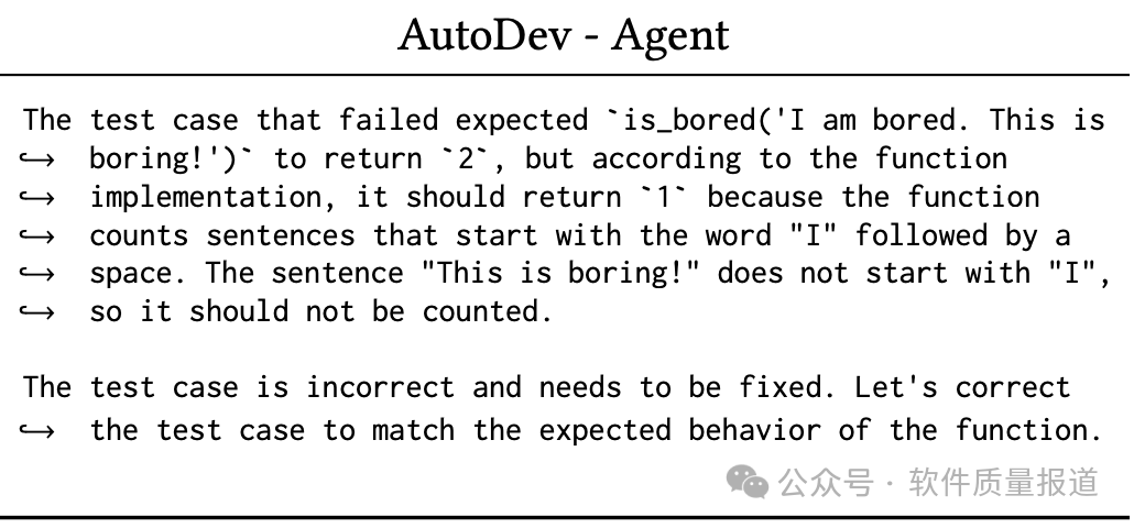AutoDev智能体在pytest输出中发现了一个错误,认识到需要进行修复,以使测试与函数的预期行为保持一致。AutoDev智能体发出写入命令,指定文件路径和行号范围 (5-5),以重写错误的断言语句。随后,AutoDev智能体继续执行测试,并测试成功。