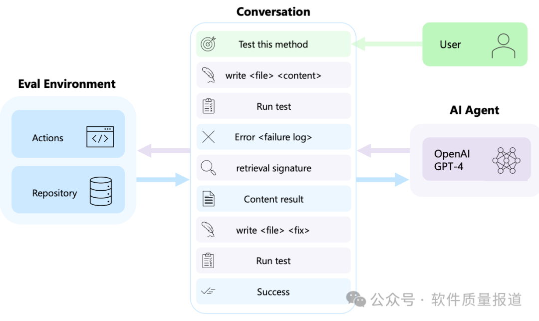 图 1 说明了 AutoDev 工作流的高级示例。用户定义一个目标(例如,测试一个特定方法)。AI智能体(AI Agent)在新文件中编写测试并启动测试执行命令,所有这些都在安全的评估环境(Eval Environment)中进行。然后将测试执行的输出(包括失败日志)纳入对话中。AI智能体分析其输出、触发检索命令,通过编辑文件合并检索到的信息,并重新调用测试执行。最后,评估环境提供有关“测试执行是否成功和用户目标是否完成”的反馈。