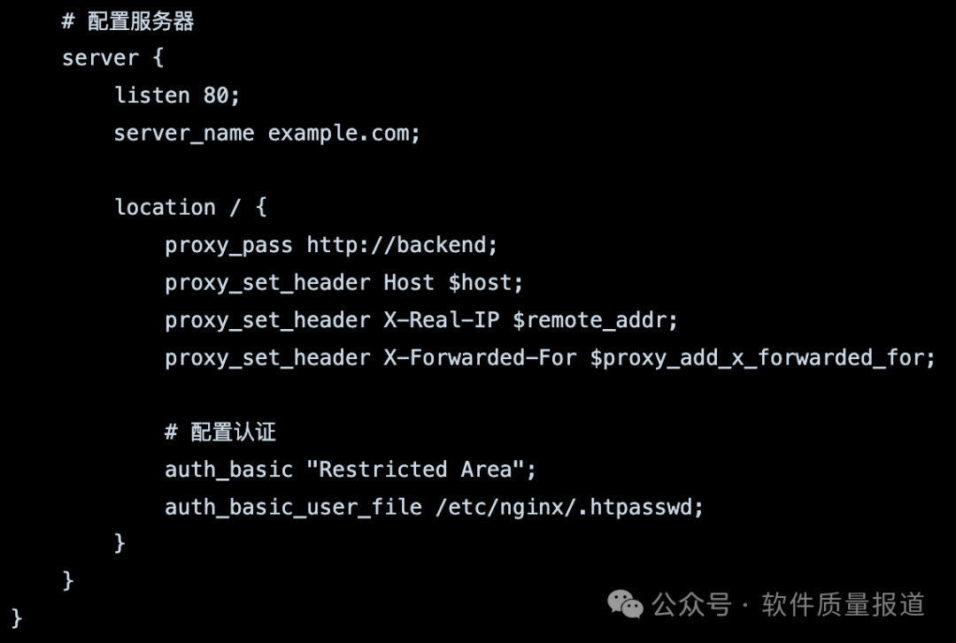 - 认证配置:使用 auth_basic和 auth_basic_user_file配置实现基本身份认证。你需要将 /etc/nginx/.htpasswd替换为实际存储用户名和密码的文件路径。该文件需要使用 htpasswd命令生成。