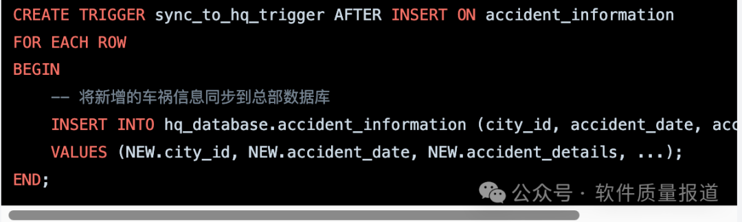 - 当有新的车祸信息写入时,首先将信息写入城市数据库的 accident_information表中,然后再将该信息写入总部数据库的 accident_information表中。
