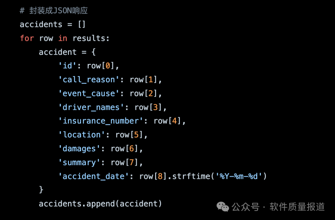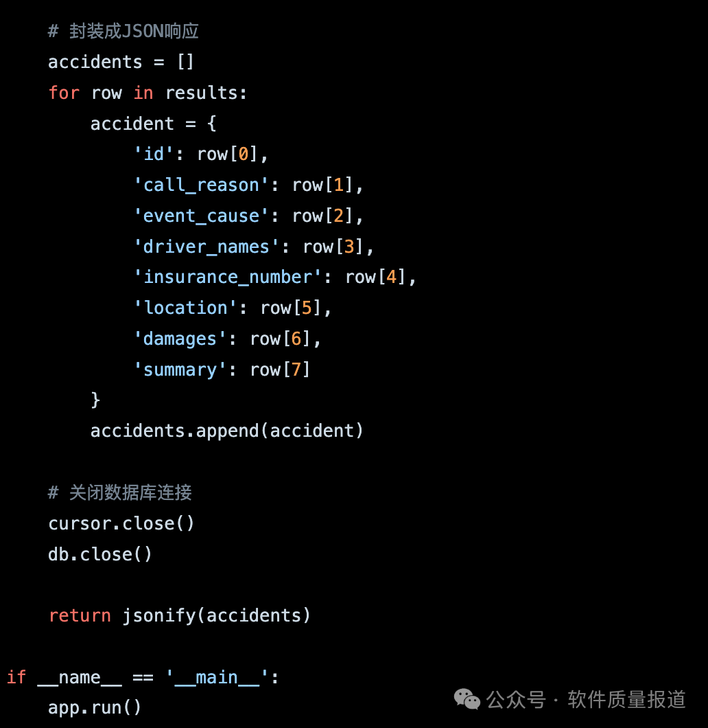 通过运行上述代码并访问 /accidents?insurance_number=546452,你将获得保险号码为 "546452" 的车祸信息的JSON响应。你可以根据需要扩展和定制该API,以适应你的具体要求。