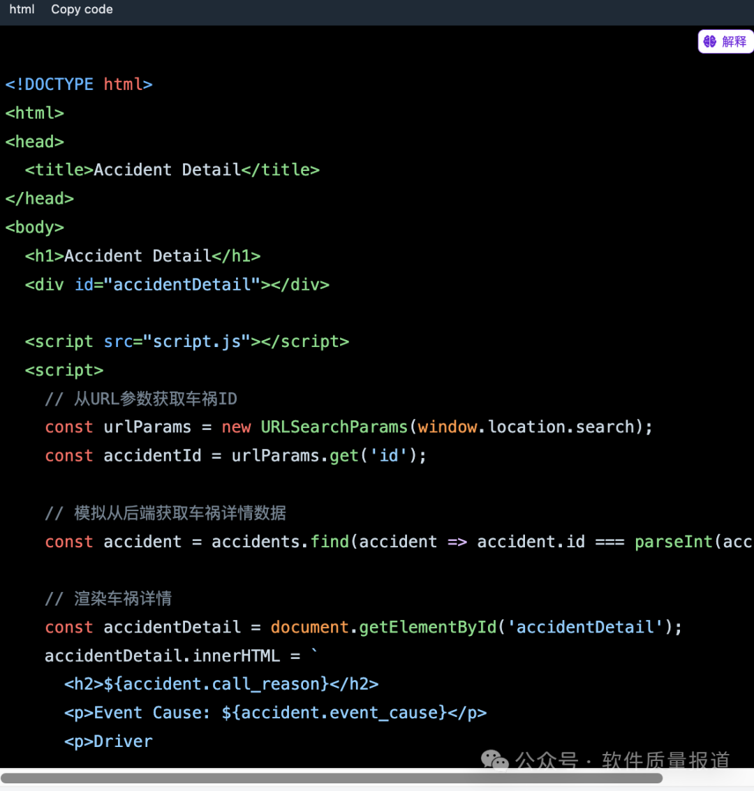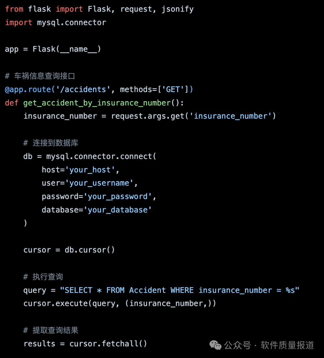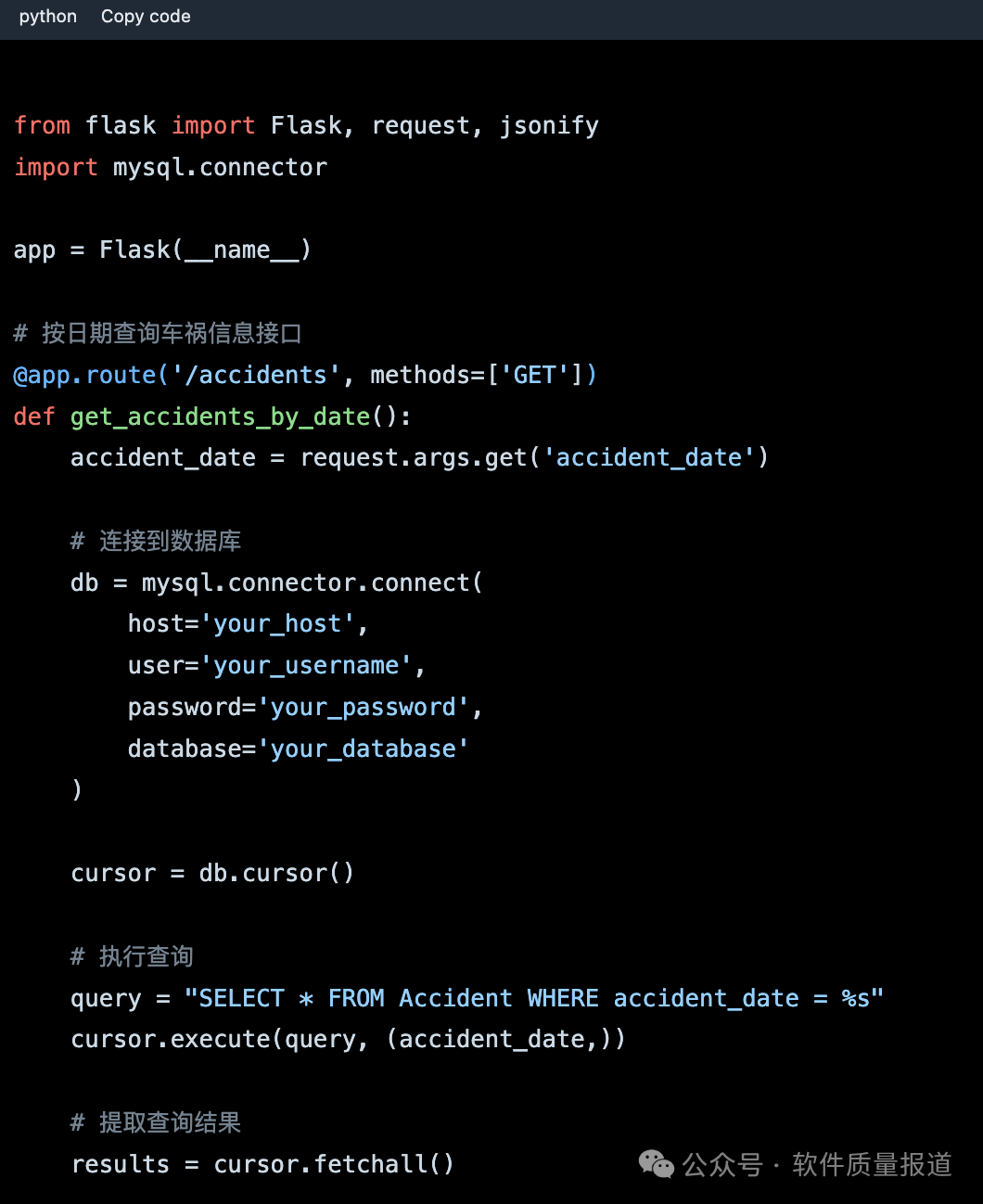 :以下是一个基本的示例,将查询车祸信息的SQL语句包装成一个API,供其他程序调用: