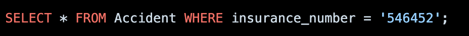 以上SQL语句将返回所有保险号码为 '546452' 的车祸信息记录。你可以根据需要替换 '546452' 为你想要查询的具体保险号码。执行该查询语句将返回匹配的车祸信息记录。