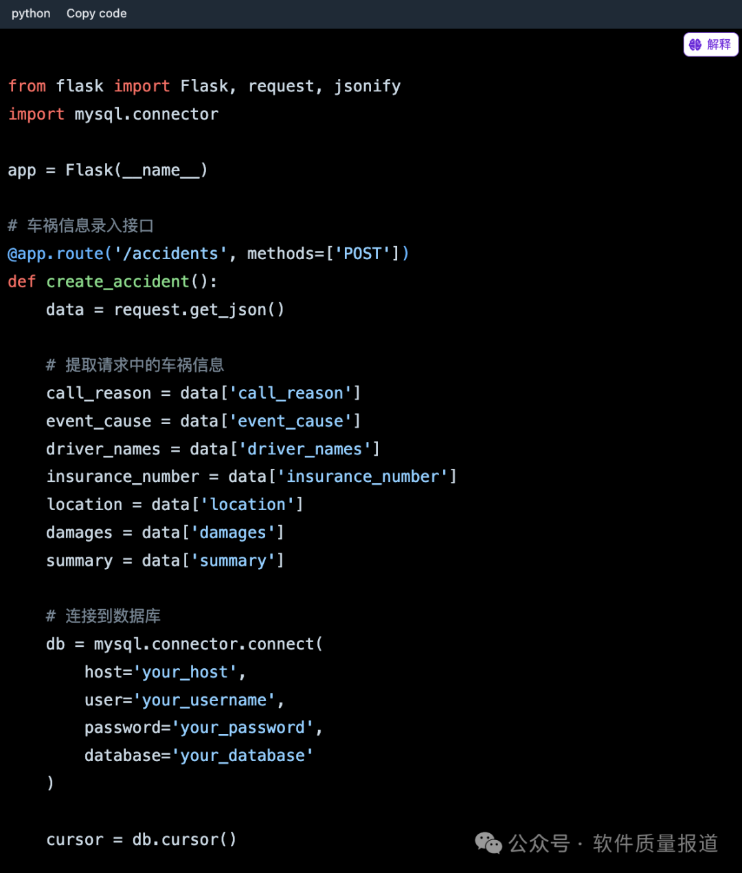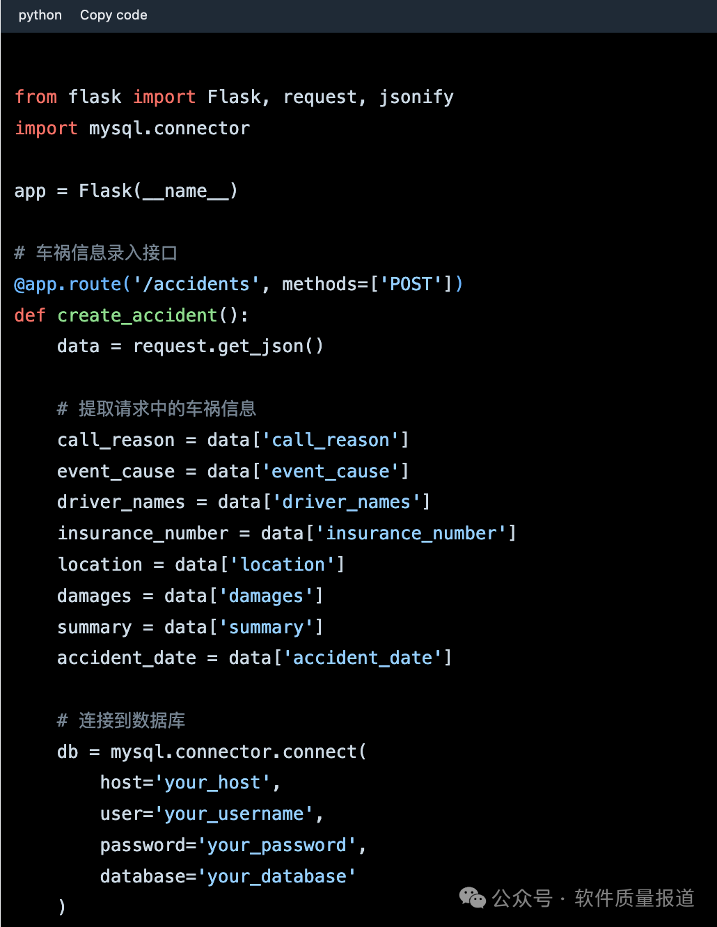 API将在数据库中插入一条对应的车祸信息记录,并返回一个包含成功消息的JSON响应。你可以根据需要进行扩展和定制该API,以适应你的具体要求。