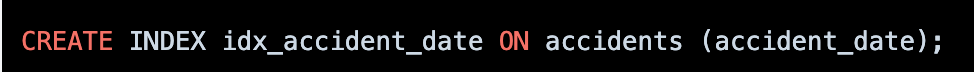 - 确保 accident_date字段上存在索引:在数据库表中创建一个索引,以加速按日期查询的速度。可以使用类似下面的语句在 MySQL 中创建索引: