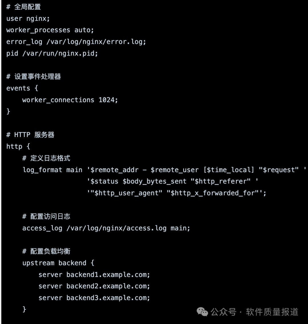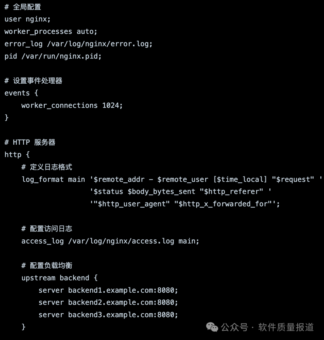 - 负载均衡:使用 upstream块配置后端服务器的地址,这里的示例使用了三个服务器。