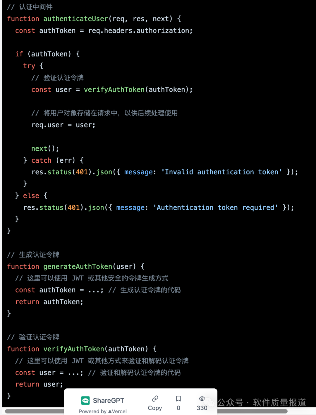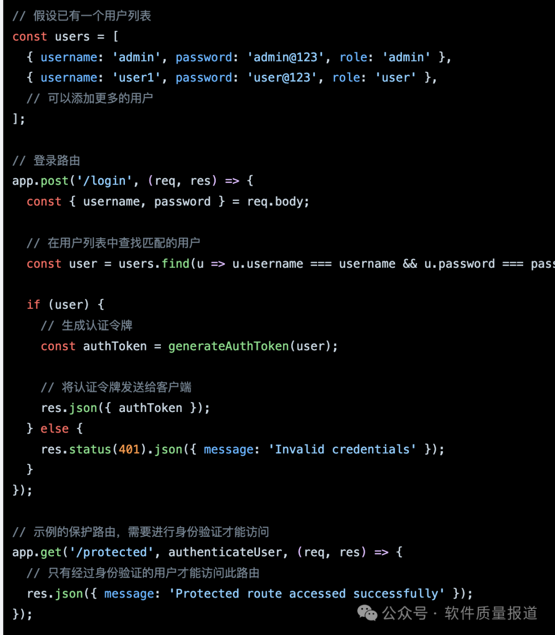 在上述代码中,使用了一个示例的用户列表来进行用户名和密码的验证。/login路由用于用户登录,验证用户名和密码,并生成一个认证令牌。/protected路由是一个受保护的路由,使用 authenticateUser中间件来验证用户身份。