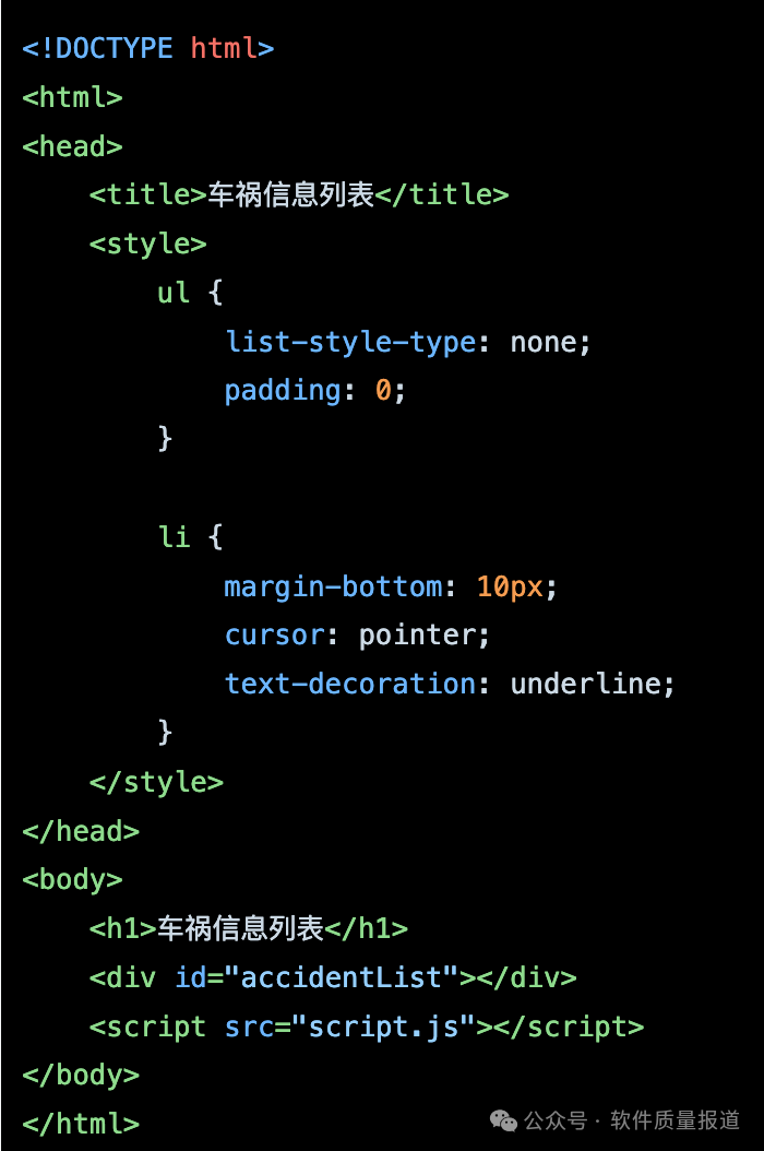 :下面是一个简单的示例,使用HTML、CSS和JavaScript创建一个Web页面,用于展示按日期查询的车祸信息列表,并在点击列表项时跳转到相应的车祸详情页面。