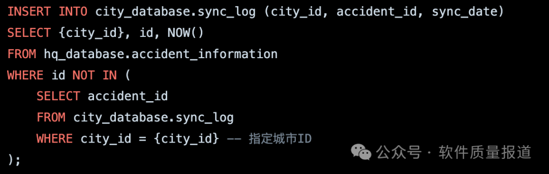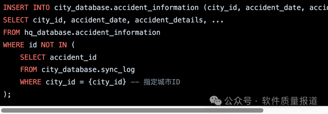 - 在总部数据库中,设置一个定时任务(例如每分钟执行一次)来检查 sync_log表,查找在最近一次同步之后新增的车祸信息,并将这些信息同步到对应的城市数据库。