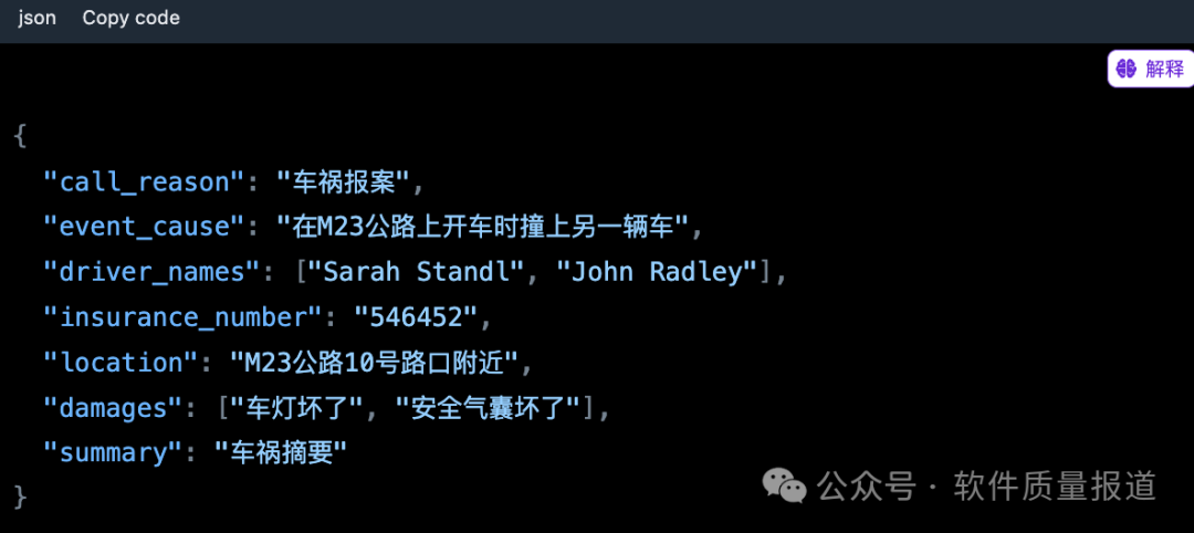 :您必须从上面的电话对话中提取以下信息: 1.呼叫原因(关键:原因) 2.事件起因(关键:起因) 3.所有驱动的名字作为一个数组(关键字:驱动名字) 4.保险号码(关键字:保险号码) 5.事故地点(关键:地点) 6.汽车损坏作为一个数组(关键字:损坏) 7.简短而详细的总结(关键:总结)