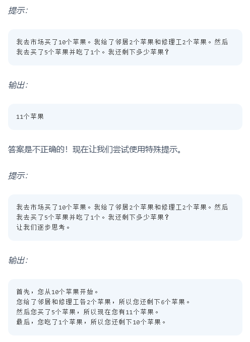 比如,如果我想让大模型帮我写一篇文章,于是就有了两种做法:2)输入信息-输出大纲-完善大纲-输出标题和正文-调整内容-输出文章在《Prompt Engineering Guide》一文中,做了一个简单的Cot测试,效果是如此有效。