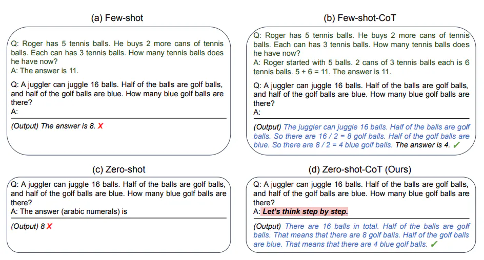 前面提到,我们要对工作流进行拆分,一步一步分解任务。对于模型从input到output的过程来说,也是如此。我们可以在中间加一个思维链(Chain of Thought)的推理过程(reasoning chain )。即:input--> Cot --> output关于Cot,常见提示词为“Let's think step by step”, 即让模型一步步思考,来提升模型的生成质量。