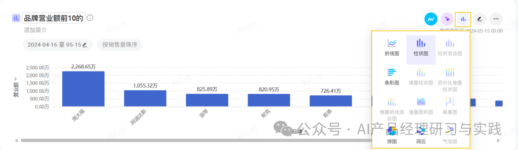 这种情况下用户除了付费开通/购买智能问数产品之外,还需要另外付费购买大模型的API(当然也有的厂商是打包收费,又或者说用户也可以选择一些免费的模型)。搜索设置是智能问数产品的核心配置之一。系统允许用户通过自然语言输入查询,系统在后台自动解析并生成相应的SQL查询语句。这种设计的关键在于如何确保用户的自然语言输入能够被准确地转化为结构化的查询。默认展示设置:允许用户定义系统在回答用户查询时的结果展示形式。这包括图表、表格、数据卡片等不同的展示方式。用户可以根据自己的偏好和具体的业务需求,选择最合适的展示形式,以便更直观地理解和分析数据。默认时间范围:在查询数据时,系统通常需要设定一个时间范围。如果用户在查询中没有明确指定时间范围,系统会自动补全一个默认的时间范围。例如,当用户查询“北京门店每季度的销量”但未指定具体时间时,系统会默认展示前12个季度的销量数据。这种设计不仅提升了查询的便利性,还避免了用户因遗漏时间范围而收到无效或不相关的结果。预测分析:开启预测分析后,系统会根据历史数据进行趋势预测,并为用户推荐相应的图表和分析结果。这可以帮助用户提前洞察未来的业务趋势,支持更为前瞻性的决策。维度分析:开启后,系统会根据用户查询的数据自动进行维度分析,例如将数据按地区、产品类别等不同维度进行细分,从而提供更为细致的分析视角。引导和推荐问题设置:用于配置新用户进入工作区时看到的引导问题,以及用户在搜索框输入时系统自动推荐的问题。这些预设问题可以帮助用户快速上手,理解系统的使用方法,并提供一些常见的业务查询示例。这和我们在自定义GPTs之类的“智能体”时也经常用到:在基础设置-展示设置中,可以管理数据和图表、表格的展示效果。通过对图表、表格的展示效果进行精细管理,用户能够根据具体的业务需求和个人喜好,调整数据的呈现方式。这一功能为用户提供了极大的灵活性和可控性。数据模型(或者说数据集)是BI系统的核心,它决定了数据的组织方式和分析的灵活性。用户可以根据业务需求创建和配置模型,包括选择事实表和维度表,并定义它们之间的关系。这样的设计保证了系统的灵活性,使得不同业务场景下的数据分析都能得到有效支持。创建模型是用户将数据表、维度、指标等组织成一个完整的数据模型的过程。用户可以选择数据表作为模型的基础,并定义数据之间的关系(如事实表与维度表之间的关联)。这个过程包括为模型选择合适的字段、设置字段的类型(如时间维度、数值指标等),并配置这些字段的展示方式。关于数据模型的更多示例,可以参见《AI+BI:结合大语言模型实现对话式的智能报表系统》中关于【百度Sugar BI 智能问数上手初体验】的内容,本质上是相似的。维度配置:系统允许用户为维度配置关键词、数据类型和展示格式,并支持复杂的时间维度设置。这使得用户能够在查询中灵活使用多种维度,提升了数据分析的深度和广度。别名和同义词管理:借助大语言模型的能力,系统可以根据数据中的自然语言内容自动生成同义词,用户也可以手动添加。这一功能极大地提升了系统的语义理解能力,确保用户使用不同表达方式时,系统仍能准确解析。当然,用户也是可以自行维护的,比如当系统无法自动关联同义词时,用户也可以手动添加同义词,如“上海”和“申城”。别名是指字段关键词的别称,例如“营业额”和“销售额”、“GMV”、“收入”等。同义词是指某个字段维度值的同义词,例如“北京”和“京城”。1. 同一维度中配置的相同同义词将被视为失效,如河北和河南的同义词不能同时为“河”;