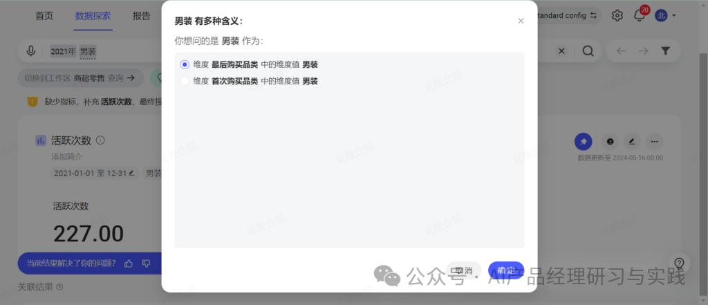 特别地,它还支持2个特殊问法(对于有SQL基础的读者来说比较容易理解):1.  如果需要精准匹配,可以用 维度是(xx) 这种方式提问;