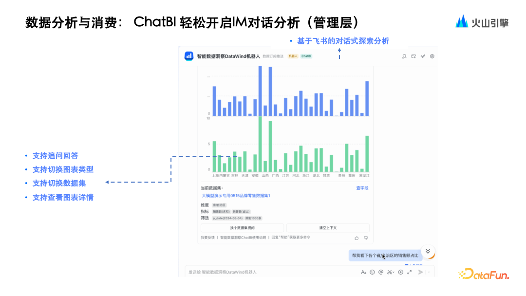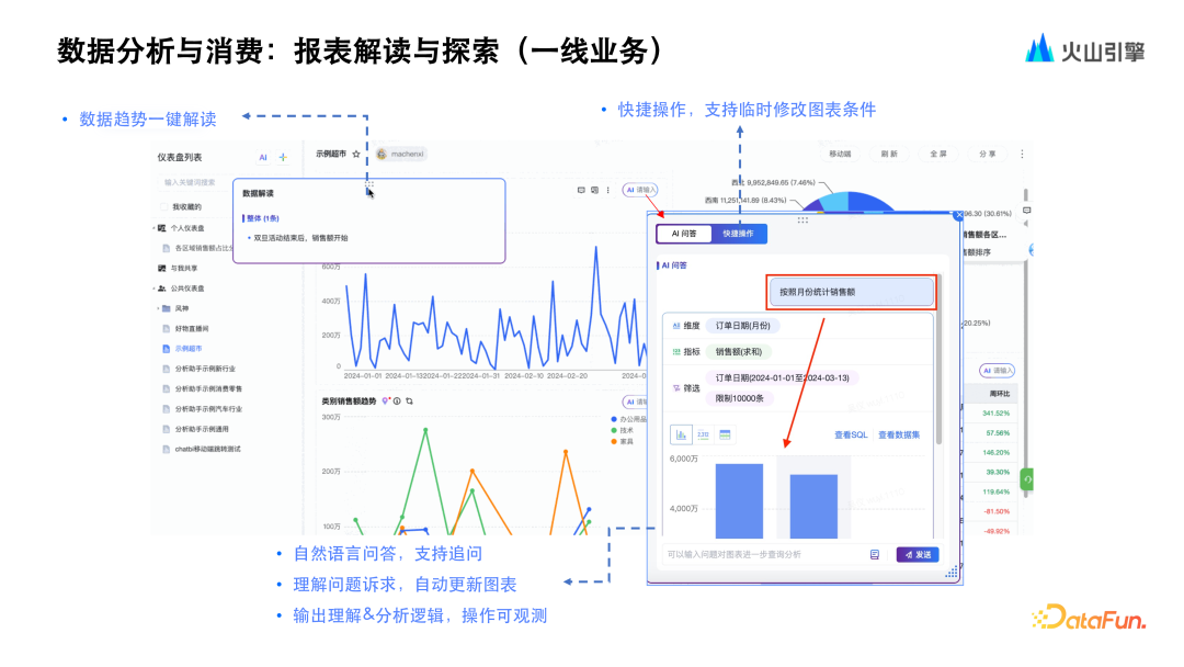 - 对于一线业务人员,提供了 AI 洞察、数据解读以及图表数据探索等功能,帮助他们更深入地理解数据。