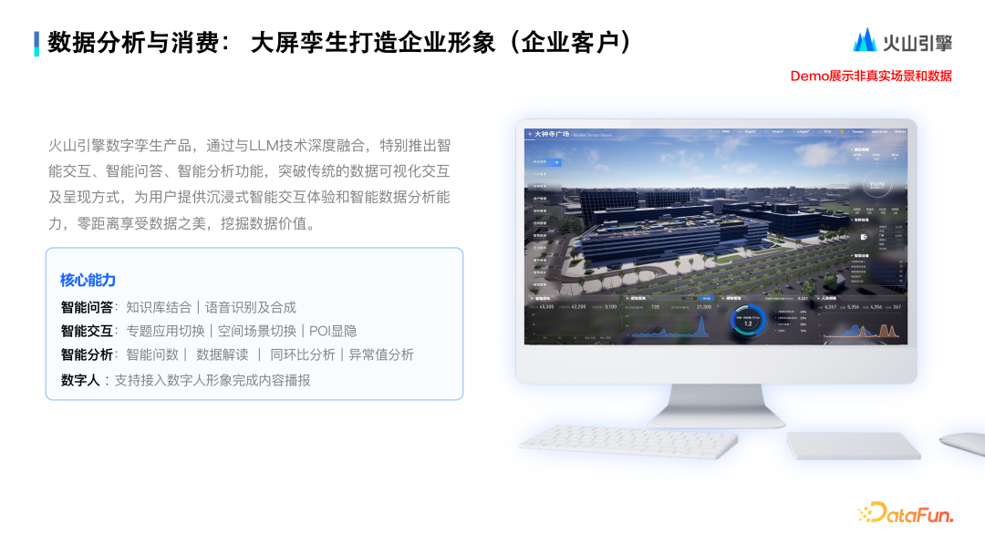 针对政企客户及企业宣发与形象推广需求,BI 系统能提供大屏与数字孪生等先进功能。在此场景下,DataWind 探索并融入了大模型能力,使得用户能够与大屏进行自然语言对话,即时输出相关数据。此外,用户还能通过交互获取更多信息内容,增强了场景的互动性和智能化水平。