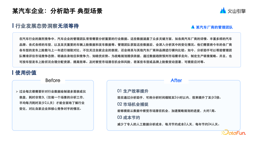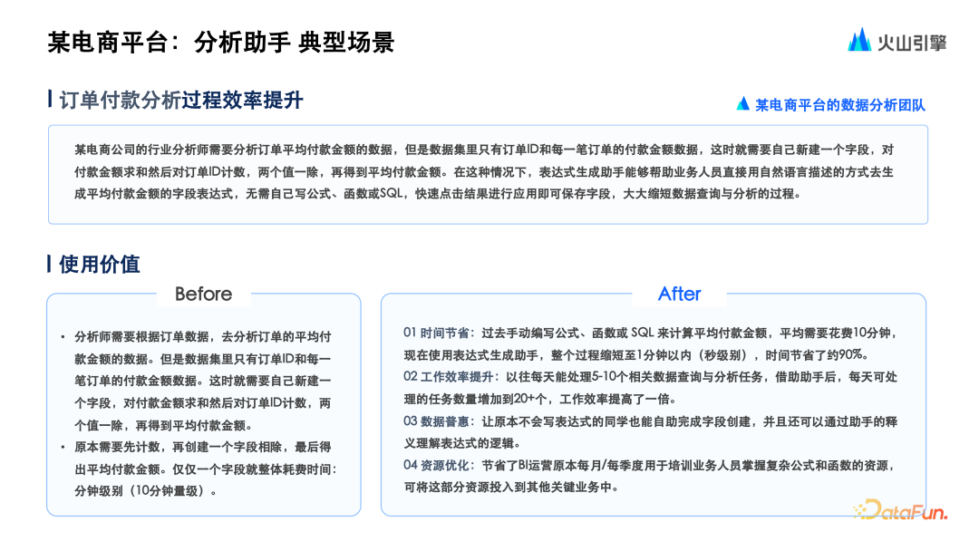 第三个 B 端案例是某电商平台。在 DataWind 大模型分析助手的能力加持下,客户工作效率得到了大幅提升。