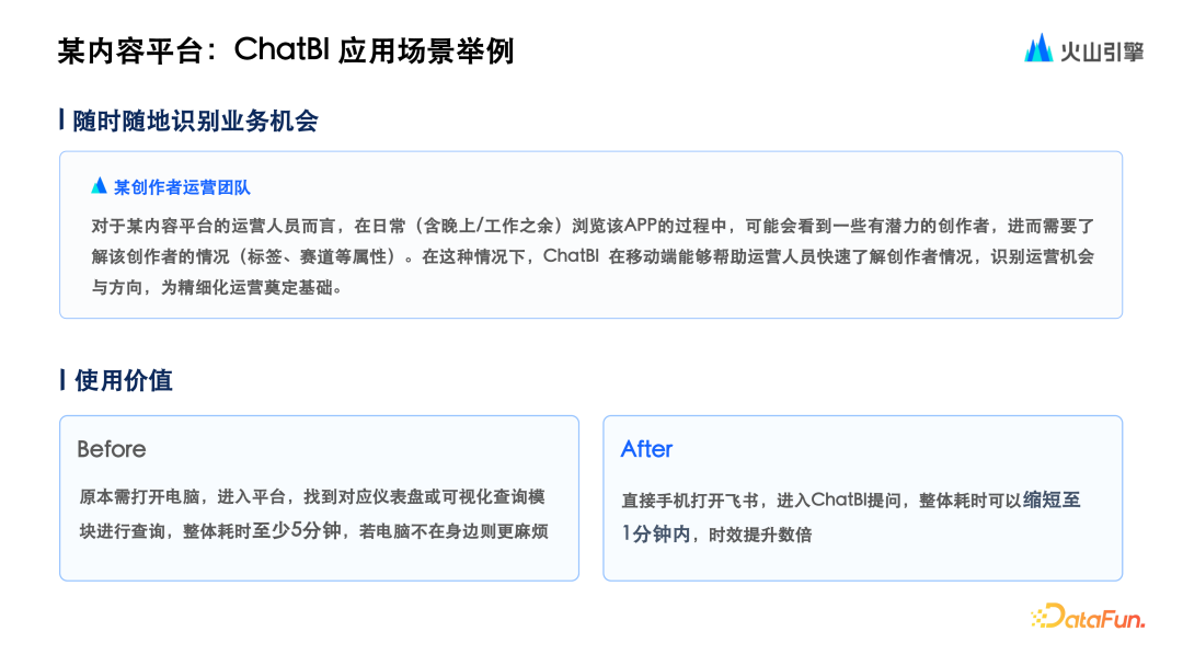 最后是一个内容平台客户案例。DataWind ChatBI 移动办公的能力,很好地满足了创作者运营团队随时随地获取信息的需求,帮助他们及时识别运营机会与方向,为精细化运营奠定了基础。