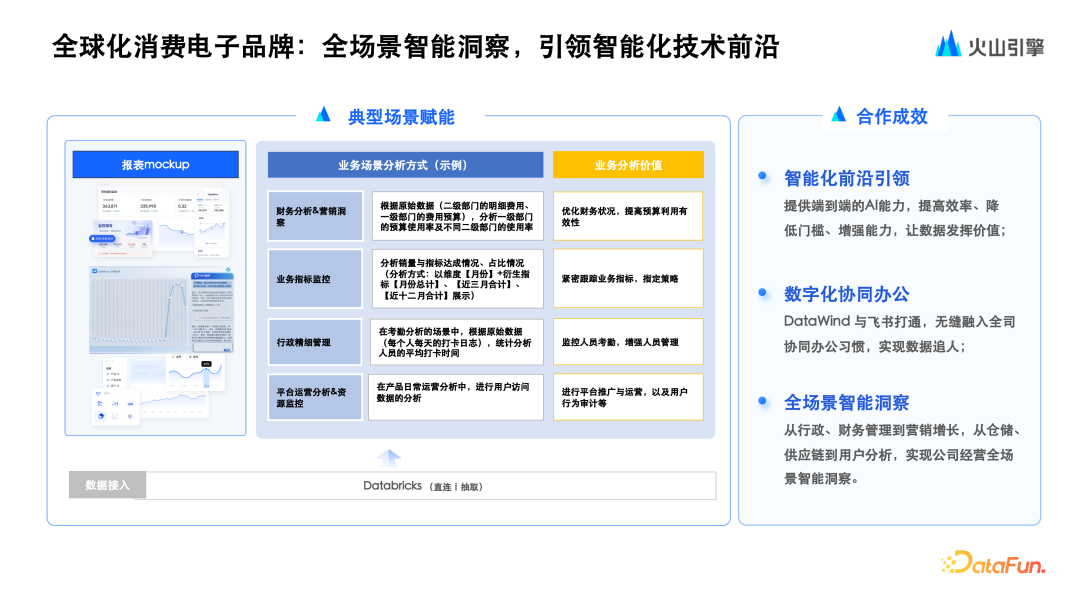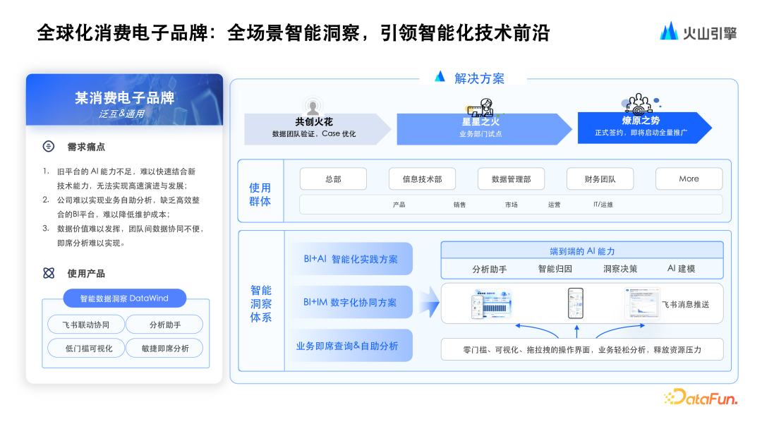 某全球化消费电子品牌面临旧 BI 平台 AI 能力不足、难以结合新技术、无法实现高速演进、业务自助分析难以实现以及缺乏高效整合型 BI 平台等问题。DataWind 凭借其优势能力,成功满足了该品牌的需求。首先,DataWind 与飞书实现了强联动协同,提升了工作效率。其次,DataWind 提供了低门槛的可视化能力和敏捷的即席分析,满足了业务的正常使用需求。此外,DataWind 当时正孵化的 ChatBI 能力也引起客户的兴趣,符合其使用理念。因此,该品牌选择了 DataWind 作为 BI 承载工具。