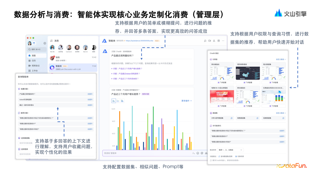 在 ChatBI 场景中,用户需基于单数据集进行自然语言问答,而在智能体中,用户则直接与智能体对话,无需关注数据集的选择。用户提出问题后,智能体会从业务链路中所有数据库表中获取相关数据,给出答案。此外,智能体还提供推荐问题、答案收藏及推送等功能,使用户能更便捷地获取所需信息。