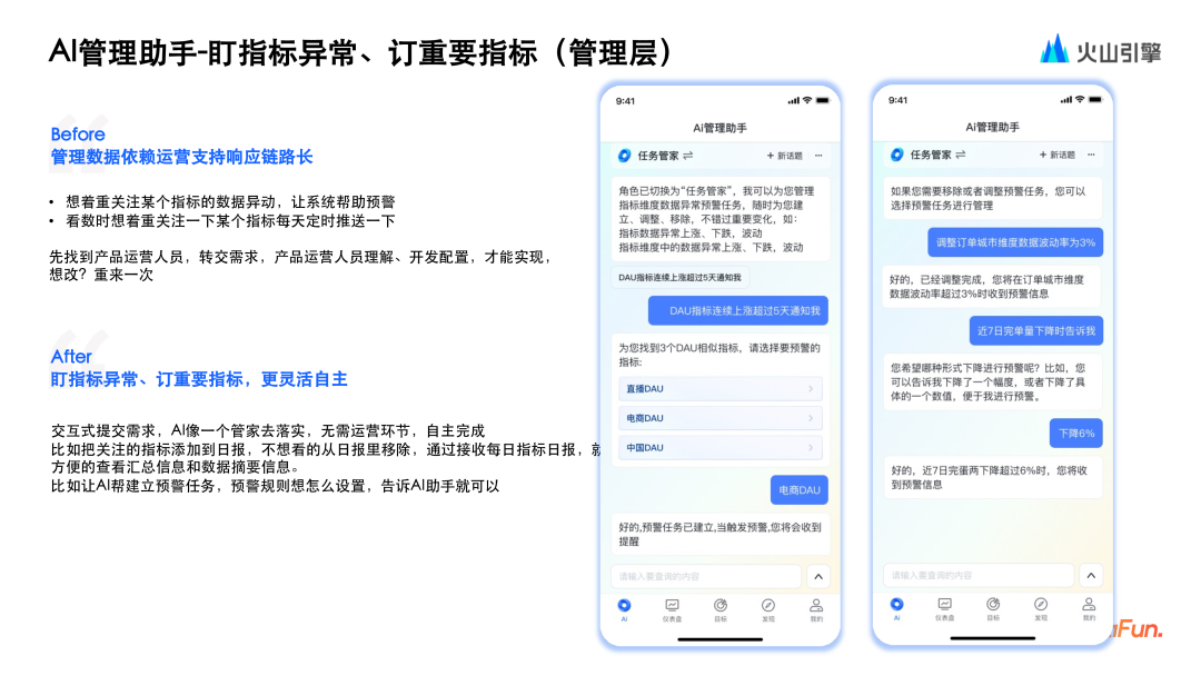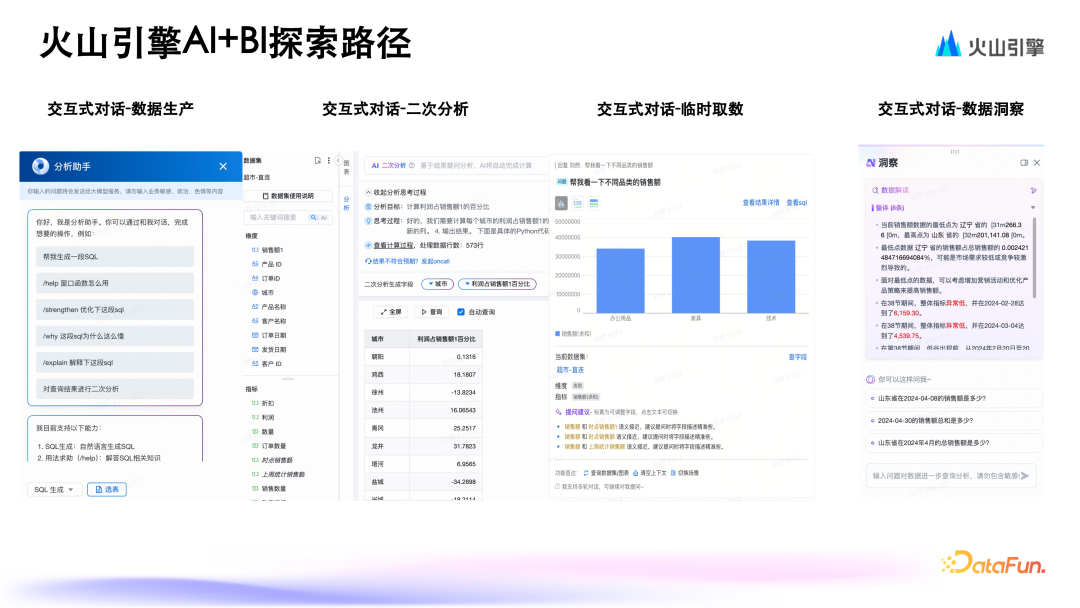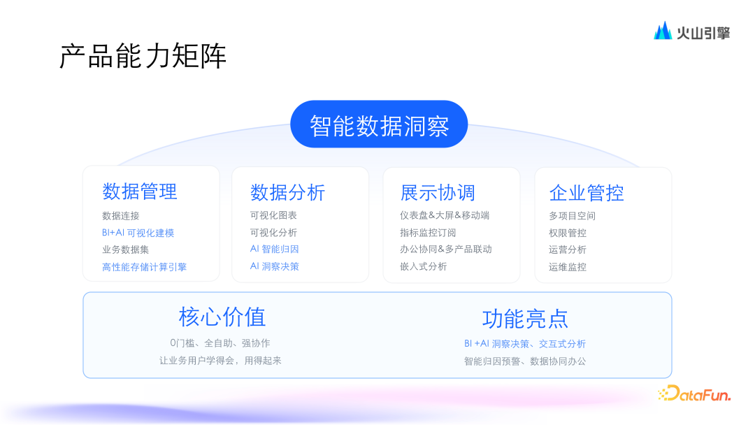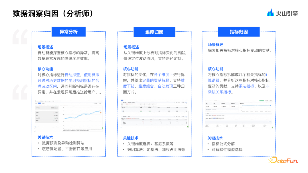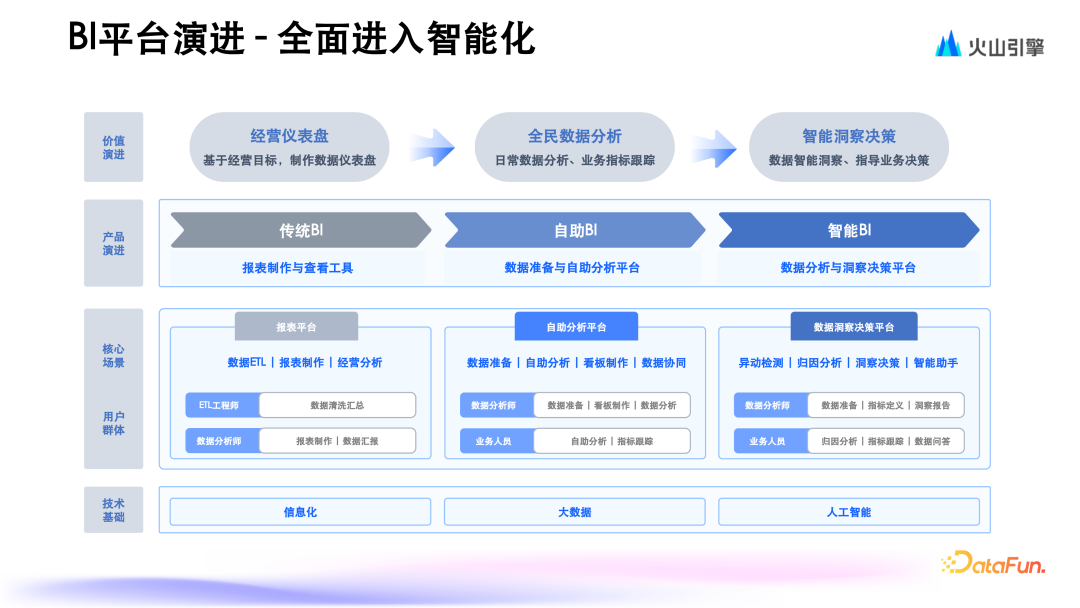 进入第三阶段,当数据生产、加工及简单的数据呈现不再是瓶颈时,基于 AI 能力、自动化及智能化的数据分析、提取及加工需求变得愈发重要。这一阶段,归因能力、基于数据的智能洞察与决策能力,以及分析助手等功能的诉求逐渐增强。火山引擎的 BI 平台正是在这三个阶段的逐步演进中,不断成熟与发展。