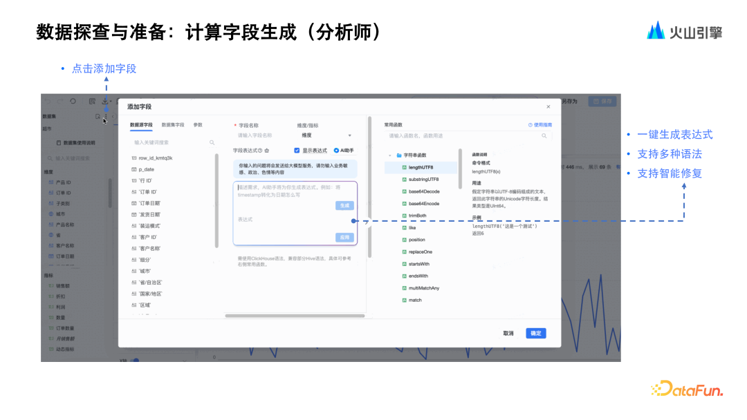 通过自然语言与大模型进行对话,分析师可以便捷地获取构建所需字段的函数表达式建议。大模型能够根据分析师的需求,智能推荐合适的函数,从而极大地降低了学习成本,提升了生产效率。这一功能虽然看似简单,但在实际应用场景中却具有高频次的使用价值。