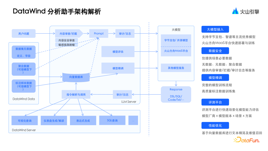 DataWind 紧密配合这一业务分析与数据使用链路,通过融入大模型技术,旨在提升整个分析闭环链路的效率并降低成本。在上述四个层次中,每一层都加入了大模型的加持,以实现这一目标。