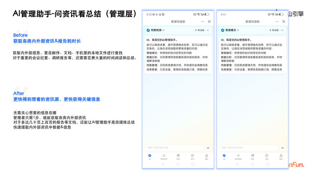 下面介绍的是一个汽车行业客户,聚焦在移动驾驶舱场景。近年来,汽车行业竞争激烈,每家汽车厂商除了关注自身核心数据以外,还会关注公共舆情、市场动态以及竞争对手的市场数据。移动驾驶舱首先可以满足管理层数据盯盘和移动办公的需求,还可以提供公域信息中的相关数据,同时还提供定期总结,完美解决了客户需求,为其降本增效、紧跟市场动态提供了助力。