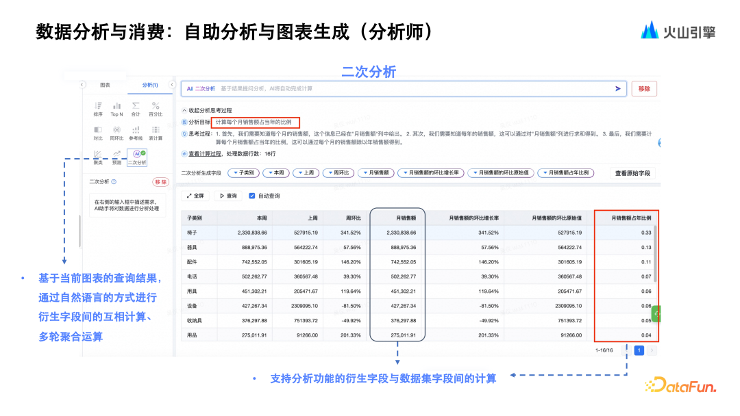 为解决这一问题,DataWind 推出了二次分析大模型能力。分析师在完成可视化查询后,可基于当前结果,通过自然语言与大模型进行对话,由大模型完成后续的数据加工工作。例如,若原始数据集中仅有销售额字段,分析师可要求大模型生成月销售额占比的衍生字段。大模型将基于当前结果直接生成该衍生字段,从而极大地简化了分析师的工作流程。