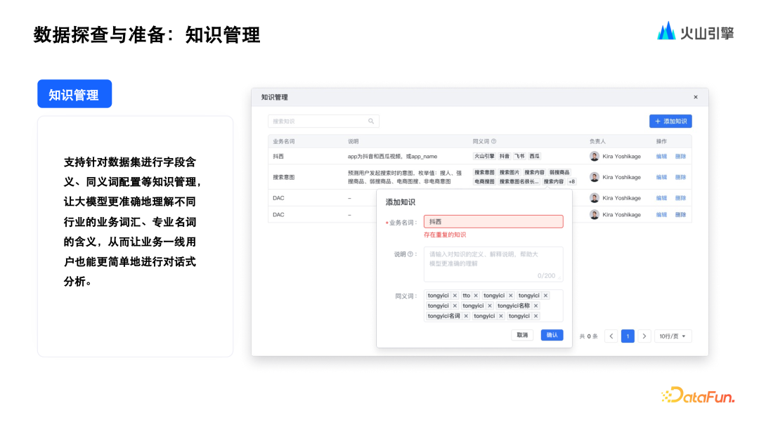 我们发现,在提供完全泛化的文案内容时,大模型的召回准确率反而有所下降。实践表明,大模型在有限且规则明确的知识体系内,尤其是经过配置化的知识语料训练后,能更好地响应客户的查询。因此,DataWind 引入了知识管理能力,针对数据集中的核心业务字段构建同义词,并补充业务场景描述,以增强大模型对行业术语及特殊词汇的识别能力。
