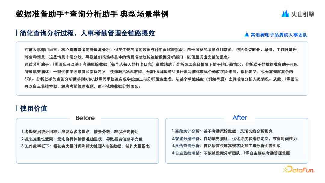 针对 HR 人事考勤部门的痛点,该客户发现考勤点众多且场景分散,难以向数据分析部门准确传达需求以生成完整报表。而通过引入分析助手,HR 团队能够基于原始考勤数据,高效地进行统计分析,精确掌握员工在不同场景下的平均出勤情况。这一解决方案完美契合了分析助手的能力,有效解决了客户的实际问题。