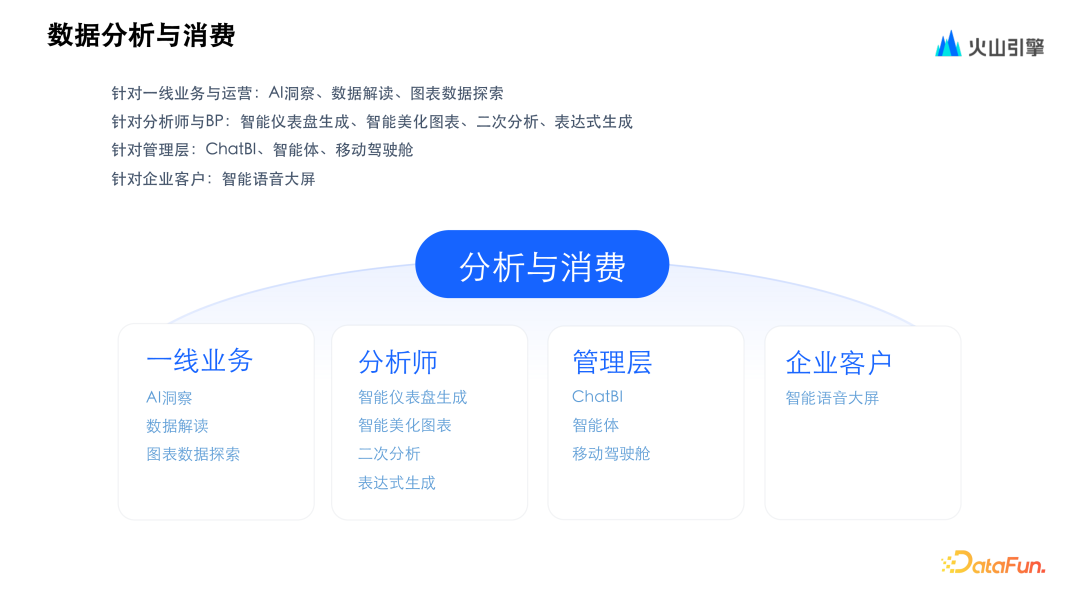 - 在分析与消费领域,该工具面向一线业务、分析师、管理层以及企业用户,提供了丰富的功能。