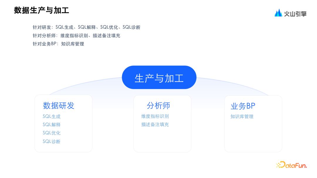 在探讨完数据消费之后,接下来看一下数据生产和加工领域,大模型功能的演进与孵化。在数据生产和加工过程中主要聚焦于三个关键角色:数据研发、分析师,以及业务合作伙伴。