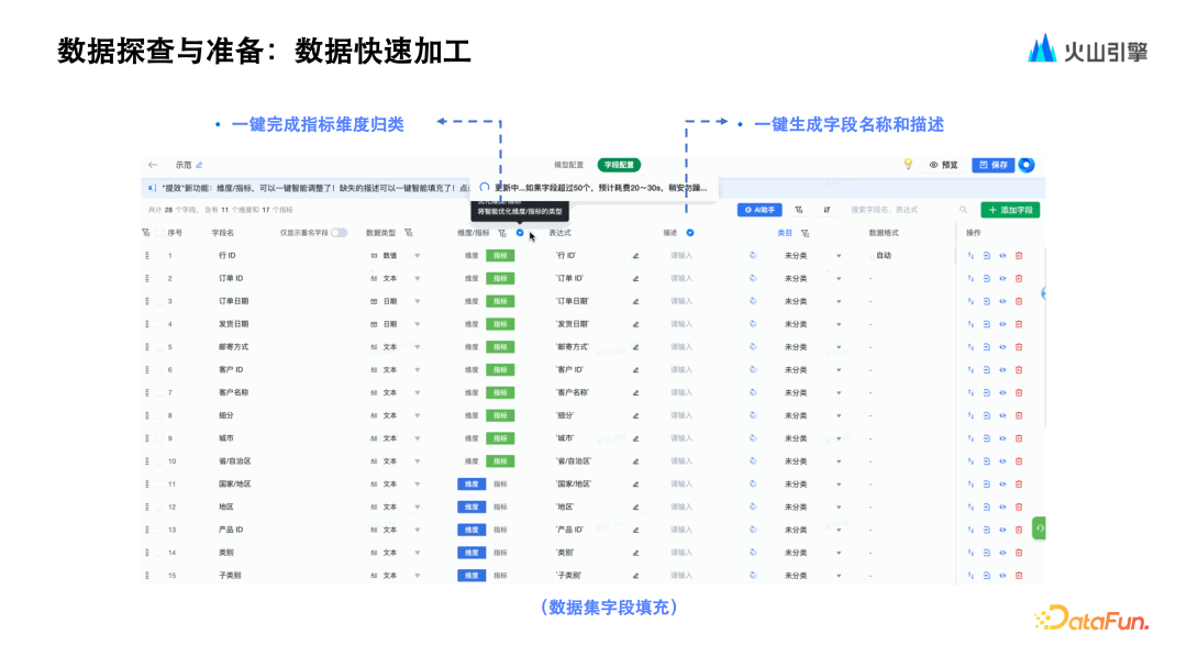 在数据生产和加工领域,结合大模型的能力,DataWind 推出了数据快速加工助手,即数据准备助手。该助手能够自动识别加工后的数据集中的维度和指标,并实现一键描述与备注填充,这一功能虽看似细微,实则作用显著。鉴于导入的数据底表、数据库表及数据集常含英文字段,为便于业务方更好地理解库表含义,大模型在识别维度、指标并进行智能填充时,会将其转译为中文。