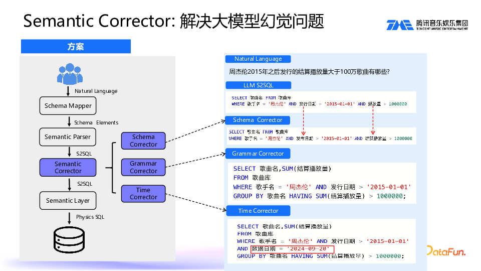 最初,我们通过融合这两者制作了一个初始版本。首先,定义好 semantic model,包括歌曲名、数据日期等维度,以及播放量、结算播放量、总播放量等指标,以及“热歌”这一术语,并为指标、维度设置权限。将这些语义在 Headless BI 中明确下来。定义好后,将这些语义告知大模型。例如,可以看到其数据库类型是 MySQL,table 是歌曲库,分区字段为数据日期,以及维度信息和涉及的指标。根据这些信息就会生成一个简单的 S2SQL,与前面包含 join 关系和计算公式的复杂 SQL 相比,这个 S2SQL 非常简单。对于大模型来说,生成 SQL 的复杂度大大降低。然后,我们通过这个 S2SQL 到 semantic layer,进行一些操作,比如权限控制、缓存,以及 SQL 解析和优化,最终得到一个物理 SQL。