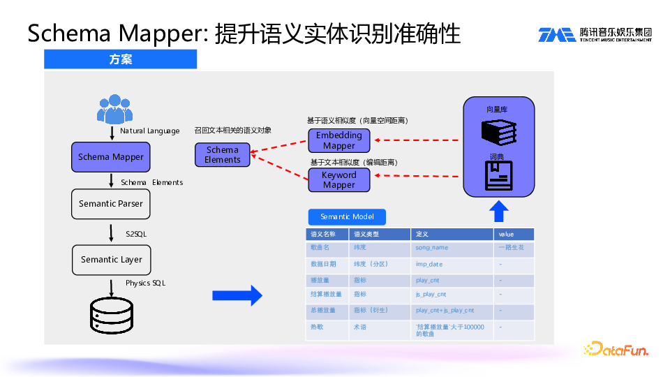 初始版本的准确率较高。但存在一个比较大的问题,因为库有很多,比如歌曲库、艺人库、专辑库等等,每个库又包含很多字段,在这种情况下,由于上下文不够,而装载的数据太多,模型就容易产生幻觉,导致生成的 SQL 错误。因此我们抽象了一个 Schema Mapper 组件来解决这一问题。2. Scheme Mapper:提升语义实体识别准确性