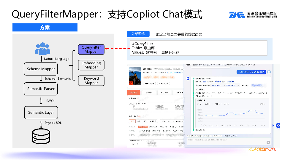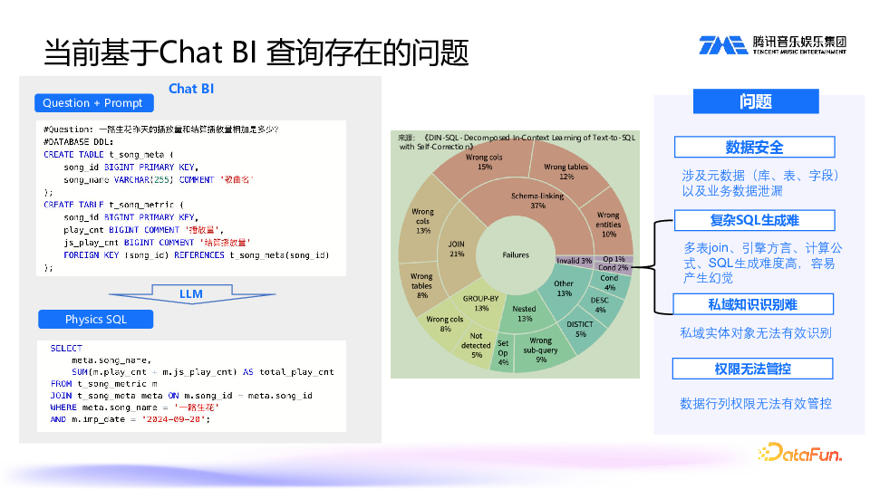 主要问题可以归纳为四大方面:首先是数据安全问题,可能出现元数据以及业务数据泄露;另外,如前文提到的,复杂 SQL 生成困难;第三,私域知识识别难,例如“一路生花”,大模型可能不知道这是一个维度值,可能会把它误认为是纬度名;第四个问题就是权限无法管控,比如结算播放量指标属于敏感指标,只允许特定的人去查看,而大模型生成 SQL 语句时很难做到权限管控。3. 融合 Chat