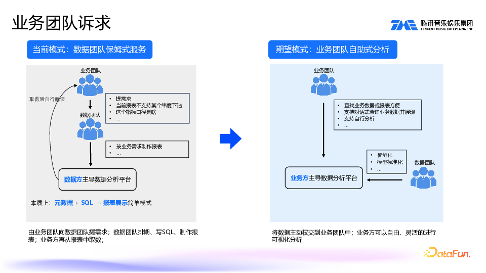 业务团队期望的模式是变数据方主导为业务方主导。他们能直接向数据分析平台询问和查询数据,自主、自由地进行可视化数据分析,并进行数据解读等。而数据团队只需做一些标准化的工作,将数据模型标准化,并提供智能化服务插件等。3. 数据团队痛点