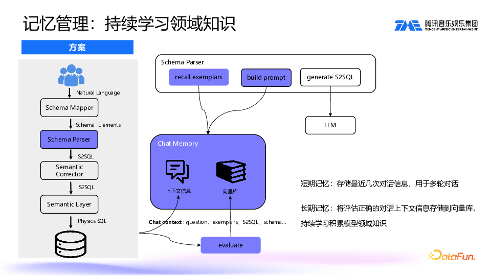 前面提到,即便对大模型进行了诸多优化,它仍有可能出现幻觉问题。主要问题有三类,即 Schema 错误、语法错误和时间错误。需要针对性地修正:Schema Corrector,修正错误的维度和指标;Grammar Corrector,修正语法错误,例如计算结算播放量大于 100 万,要加上按维度分组,再进行后过滤,加上一个 HAVING SUM;Time Corrector,没有分区日期过滤可能导致查询超时,因此需要限制数据日期,修正时间语义。5. 记忆管理:持续学习领域知识